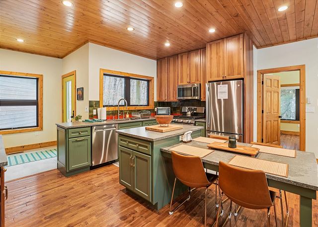 Full Kitchen, Refrigerator, Coffee Maker, Microwave, Toaster, Cookware, Dishwasher, Tea Kettle, Cookie Sheets, Casserole Dishes